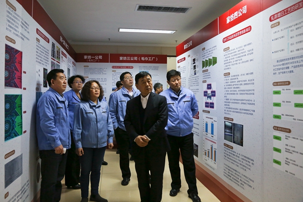 在產(chǎn)品展示區(qū),集團領導對家紡一公司雙面異效應浮雕花型多層織物,家紡三公司滌綸色纖產(chǎn)品,和家紡四公司類似棒針交織組織的機織毛巾等新材料、新組織的應用表示了贊賞。