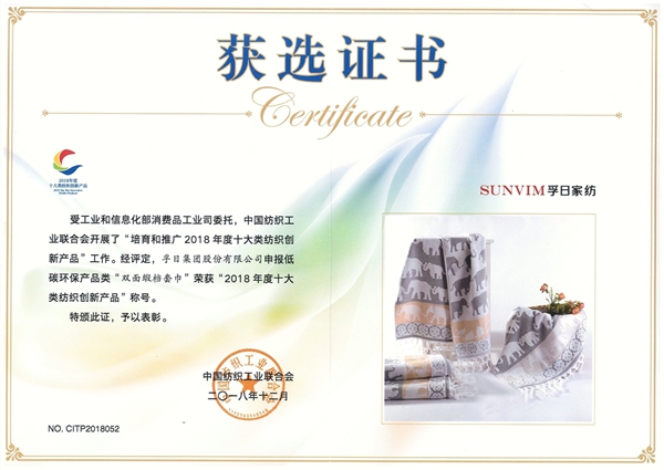 2018年12月11日,以“大變局 新格局:趨勢與展望”為主題的中國紡織創(chuàng)新年會(huì)在北京舉行。孚日集團(tuán)憑借在技術(shù)創(chuàng)新、產(chǎn)品研發(fā)等方面的探索和成績,入選首批“中國紡織行業(yè)工業(yè)設(shè)計(jì)中心”,并榮獲“中國紡織聯(lián)合會(huì)產(chǎn)品開發(fā)貢獻(xiàn)獎(jiǎng)”,“雙面緞檔套巾”和“鏤空遠(yuǎn)紅外印花床品”上榜“2018年度十大類紡織創(chuàng)新產(chǎn)品”。